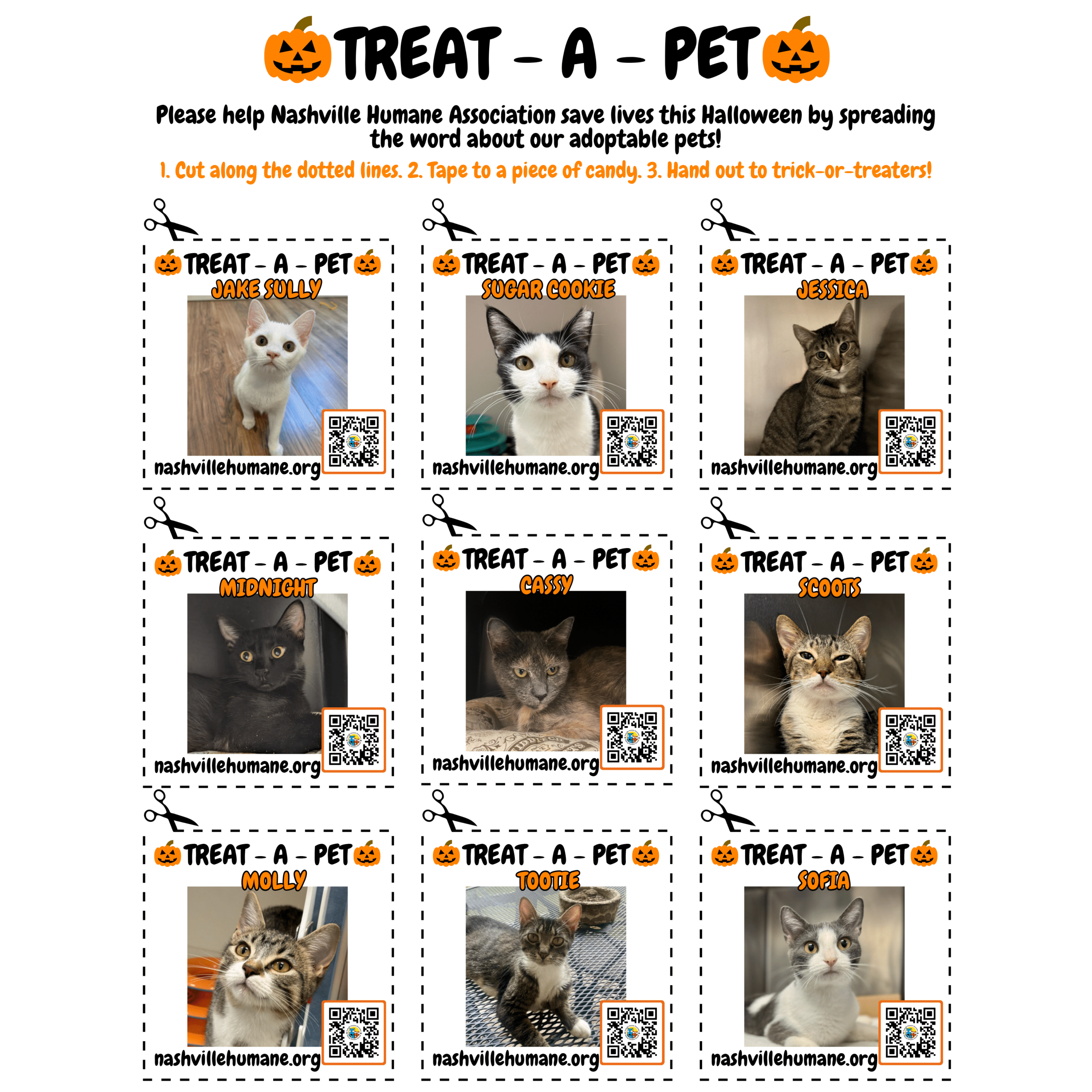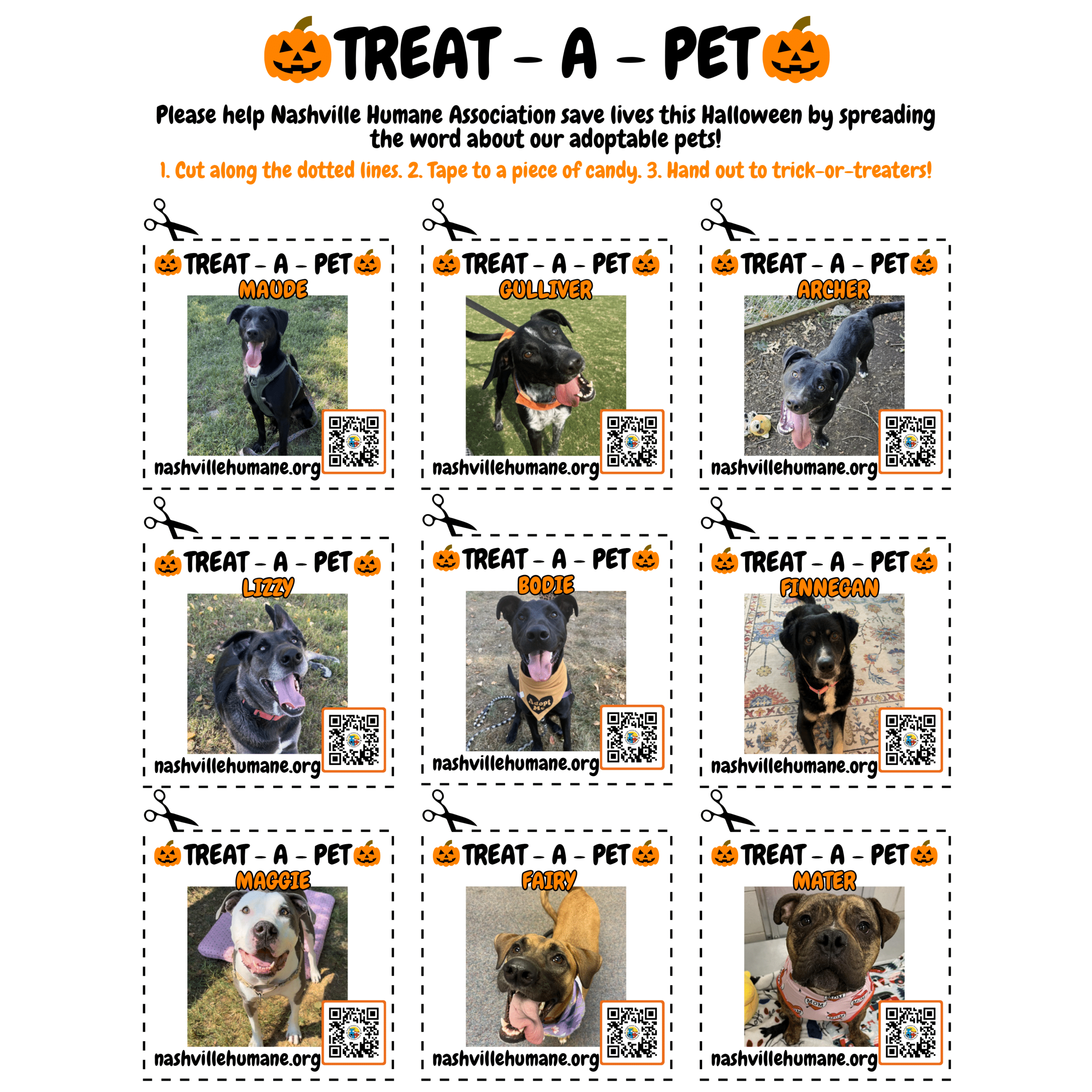 All the dogs and cats featured on these Treat-A-Pet flyers are some of our longest residents! They just haven’t found their perfect match yet, but we are hopeful this could help them do just that. Please help get these pets adopted by participating in our Treat-A-Pet Halloween Campaign!